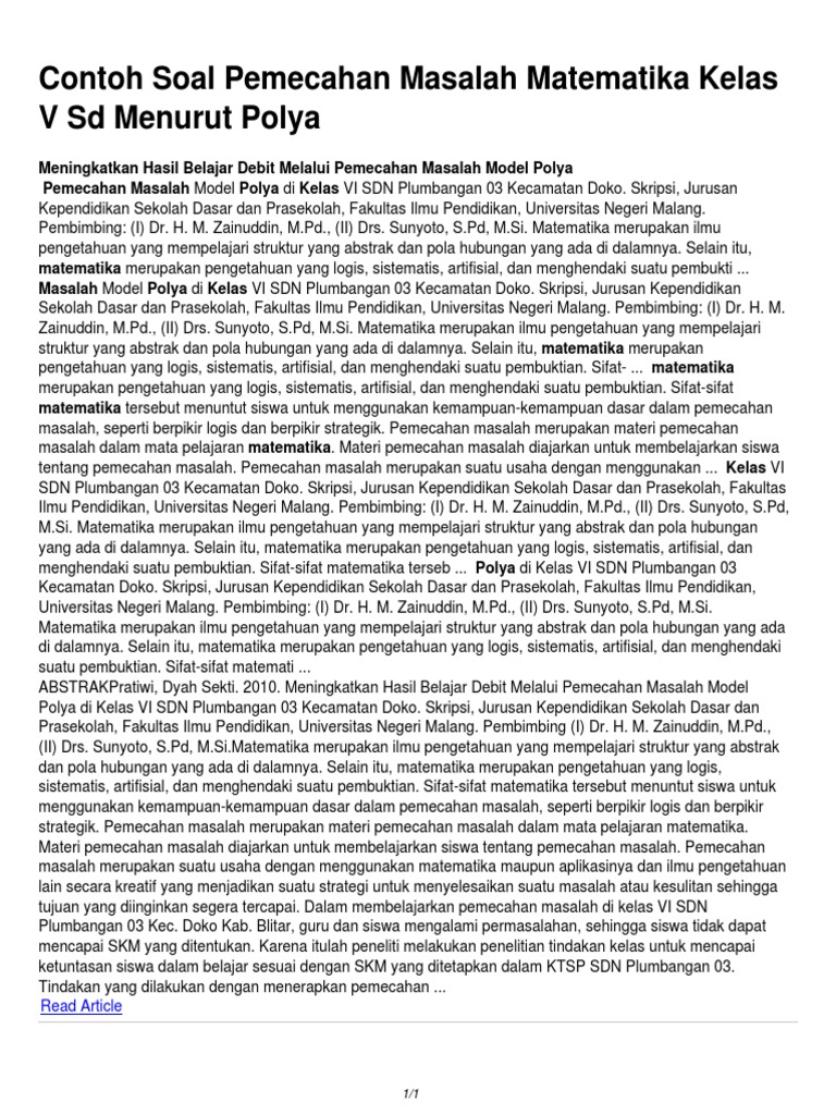 Contoh Soal Pemecahan Masalah Matematika Kelas V Sd Menurut Polya Pdf